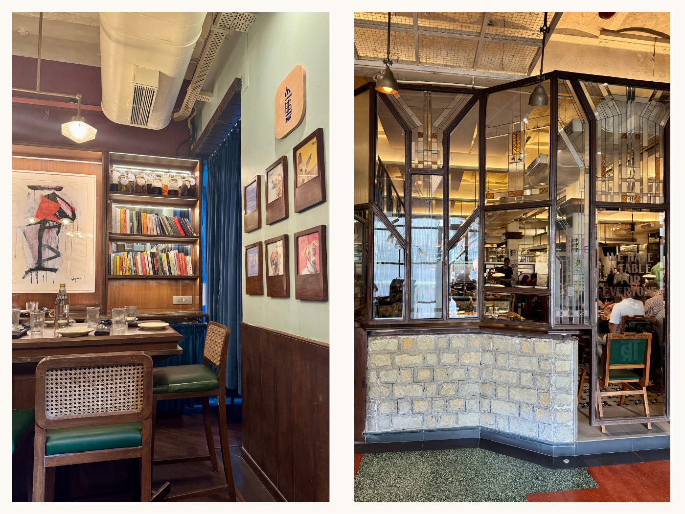 Bombay Canteen is at the other end of the traditional-to-modern spectrum. The layout nods to a colonial home with a reading room, living room, gathering spaces, but with a distinctly modern edge. Art deco and mid-century references sit next to abstract and graphic art, including little love notes to Mumbai’s architecture on the walls.