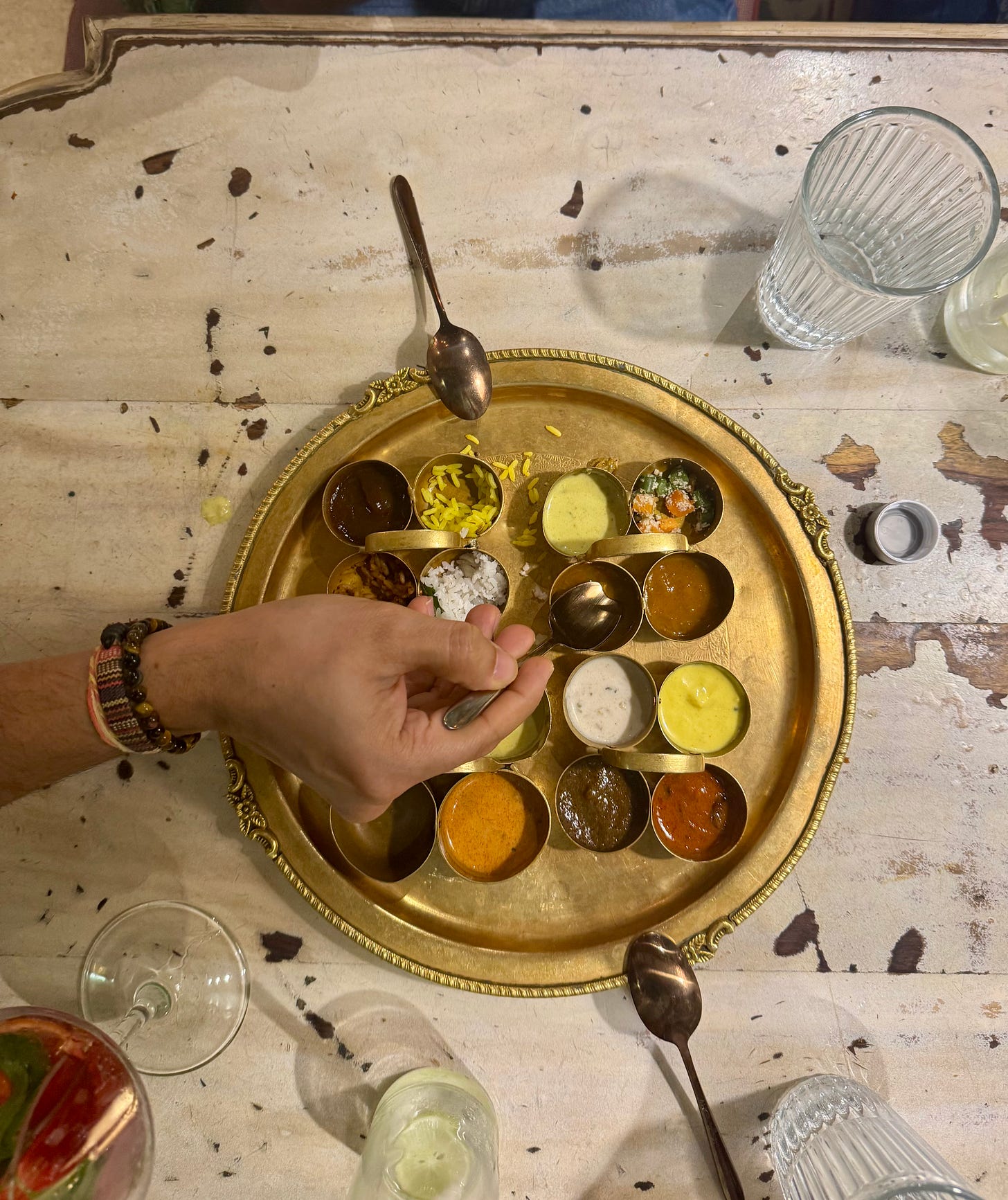 Agashiye (“rooftop”) sits on the terrace of a heritage home near Ahmedabad’s Old City. The whole place is warm light and courtyards filled with traditional craft that never feels old. You eat a Gujarati thali slowly - seasonal vegetables, daal, fresh roti and bhakri. It’s a feast, but set to the rhythm of impeccable service, live music, and the buzz of the city below you.